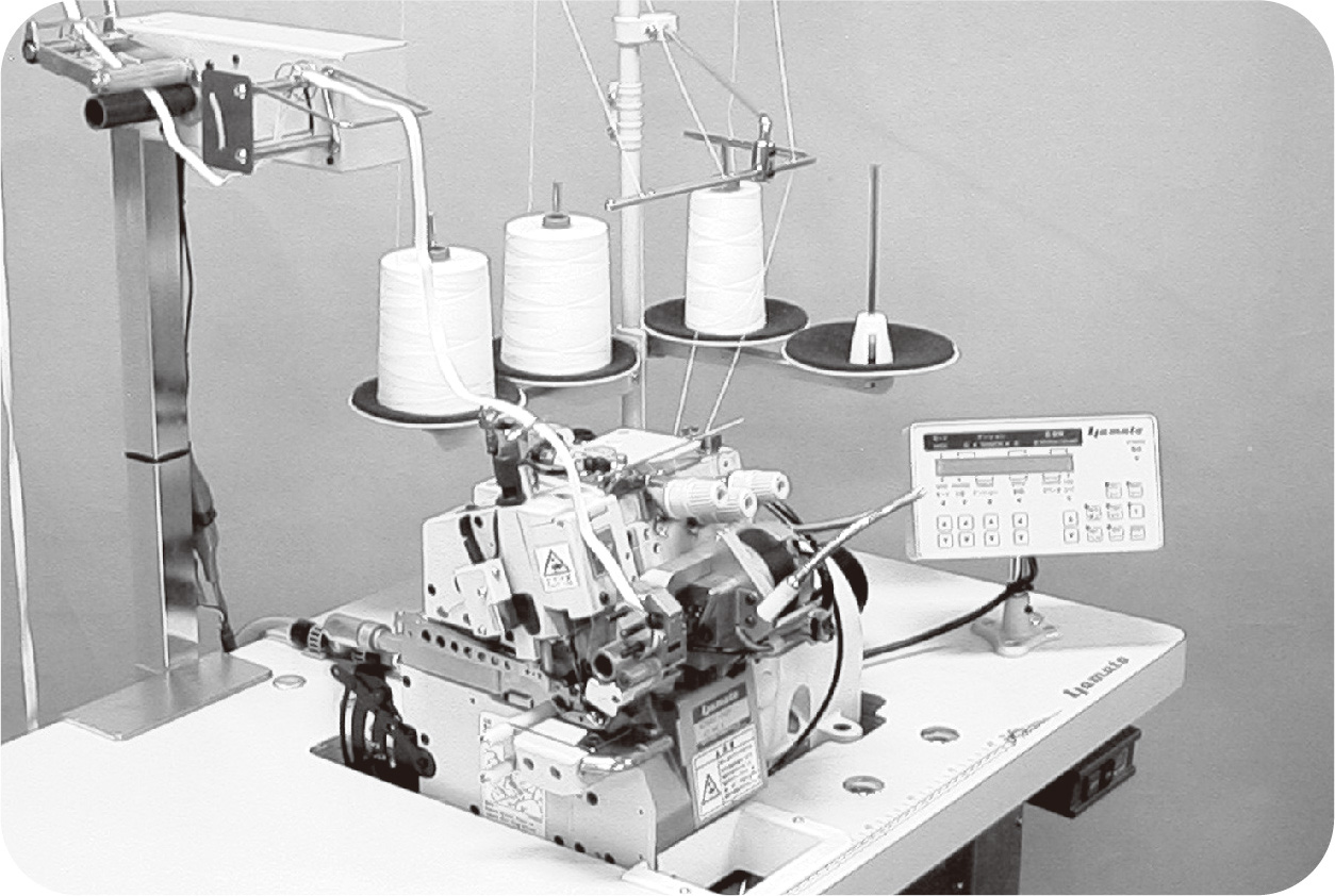 ゴム付け用 シリンダー型 1本針 3本糸 オーバーロックミシン, カッターおよびステッピングモーター式下計尺装置 付き